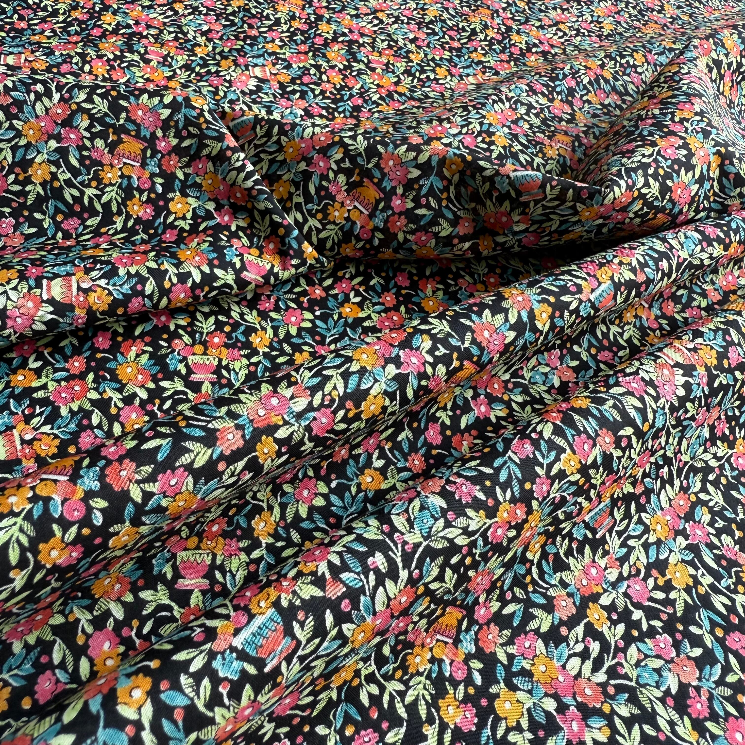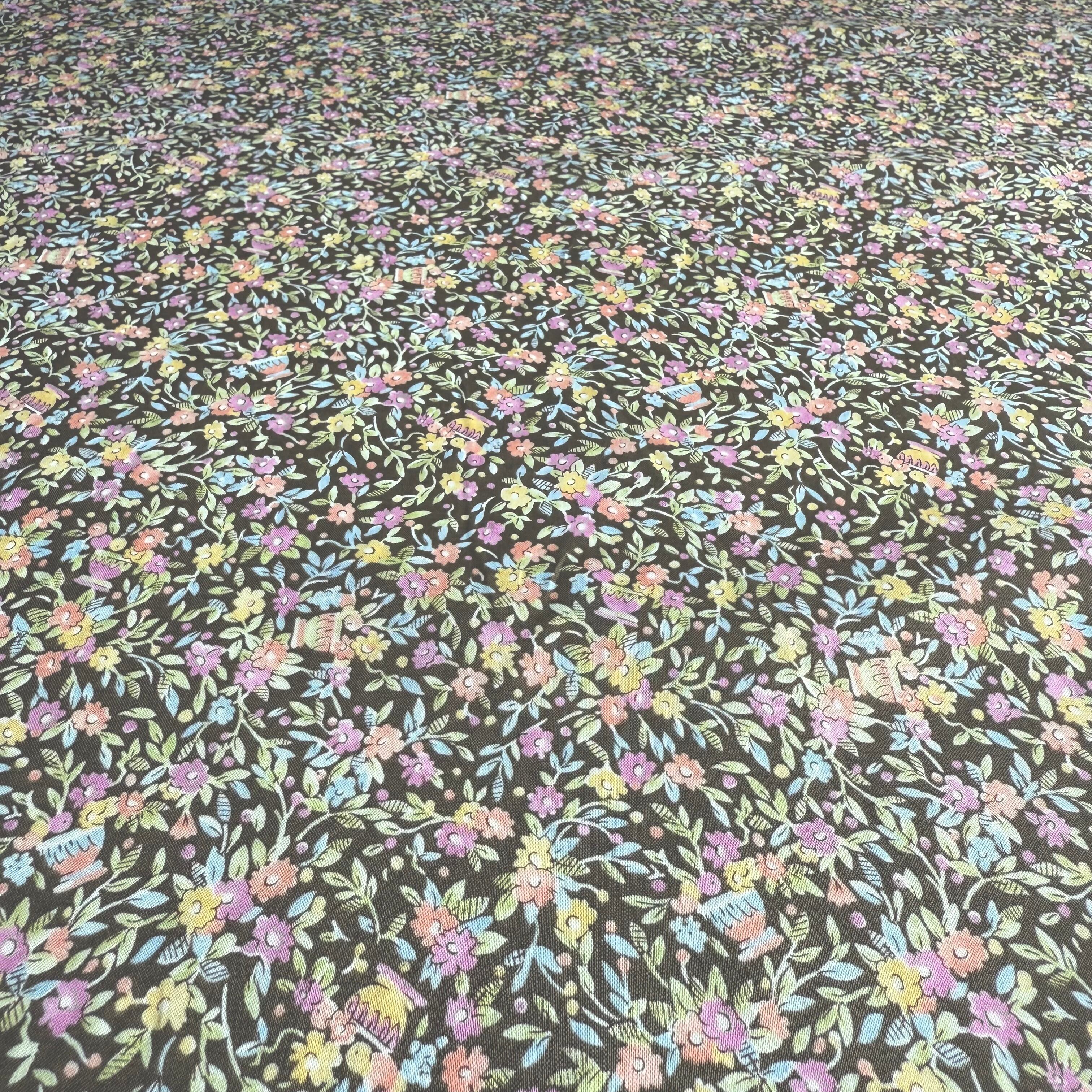 1981年にリバティのために手描きされたこの愛らしいフローラルデザインは、植木鉢があちこちに散りばめられた、どこか会話が聞こえてきそうな楽しい柄です。それぞれの鉢からは、シンプルに描かれた花や葉っぱ、果物やベリーがあふれ出し、軽やかで遊び心あふれる世界をつくり出しています。