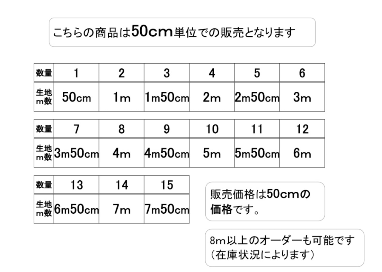 1点=50cm(0.5m) 50cm単位でお好きなm数でご注文いただけます。