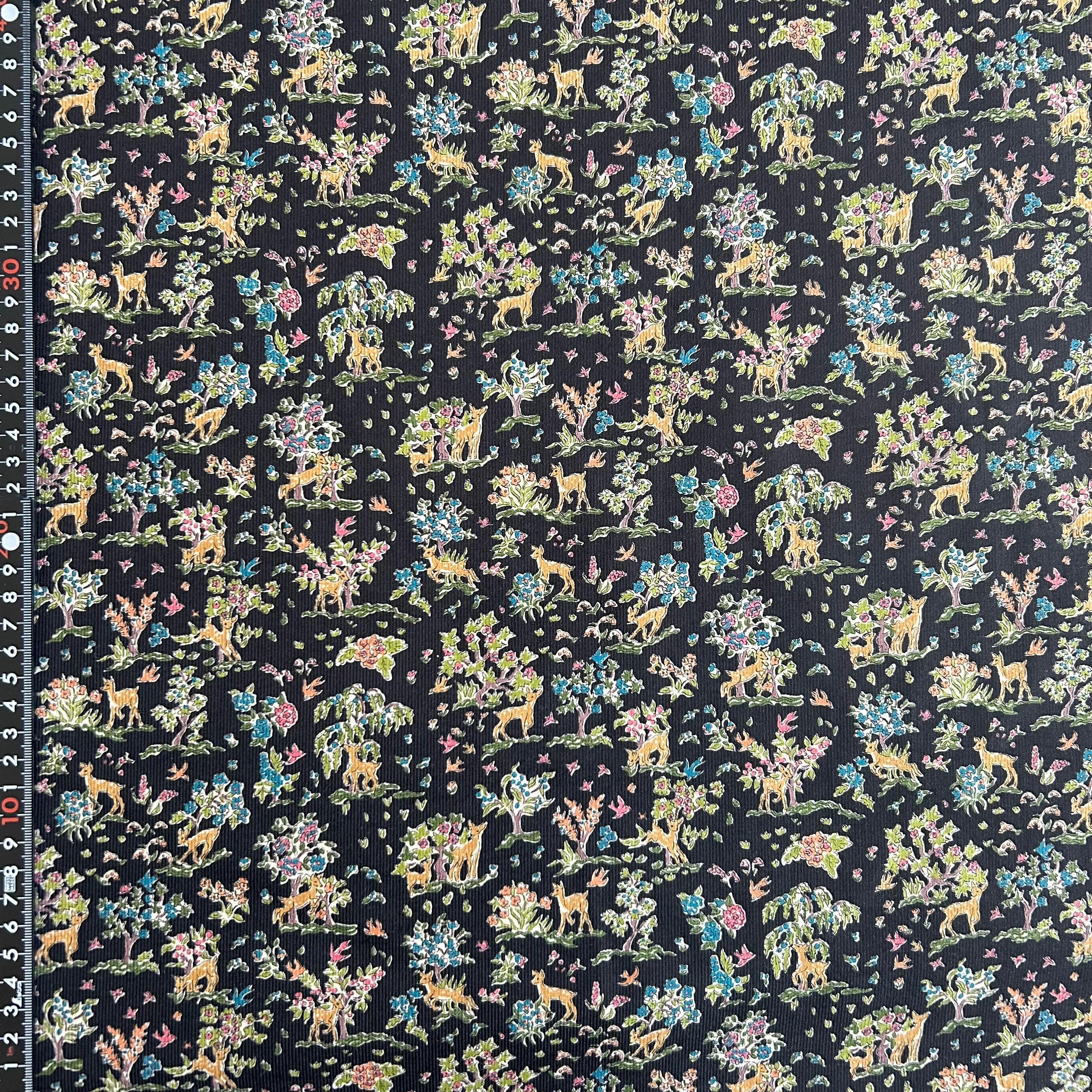 植物やベリーが生い茂る想像上の森の中で跳ねまわるダマジカを描いたチャーミングなプリントです。
