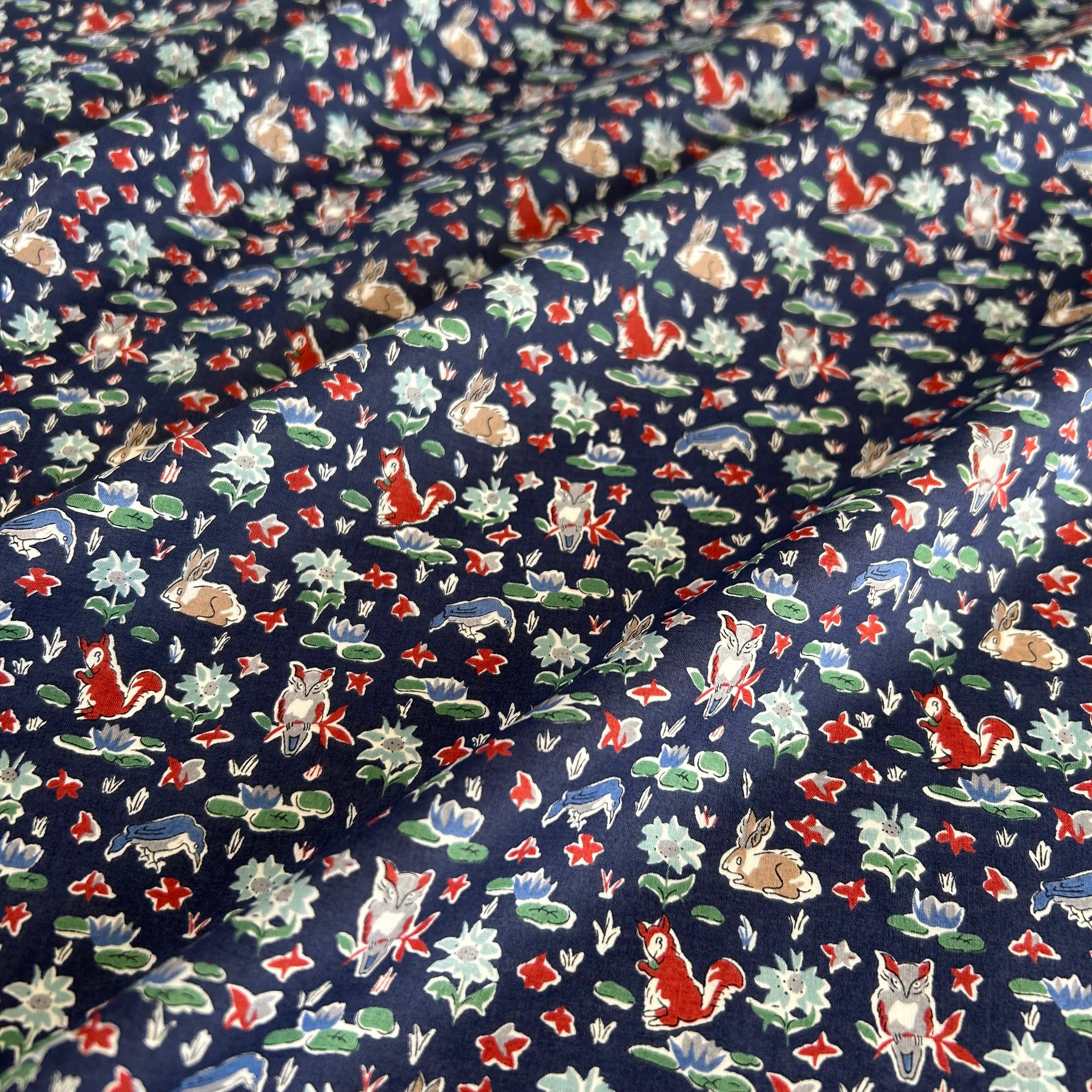 1925年頃にリバティのために描かれ、1931年から32年にかけシルクプリントされていたチャーミングなカンバセーショナルデザインです。1989年秋冬コレクションで復活した「オスカー」には、鳥、リス、ウサギ、フクロウなど森の小動物が草花に囲まれて遊んでいる様子が描かれています。